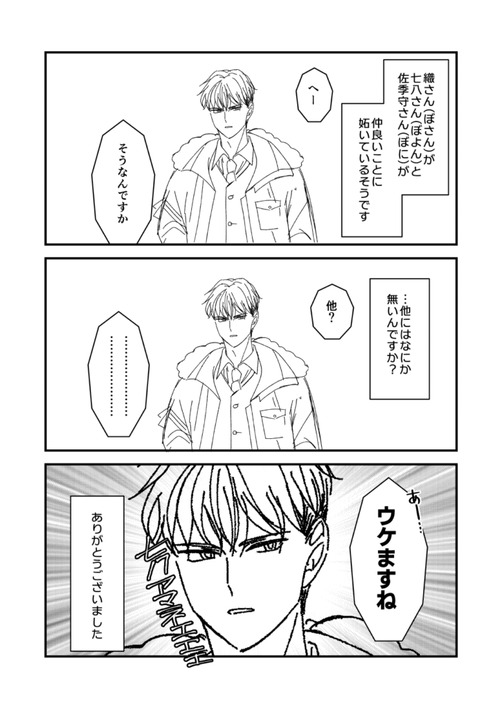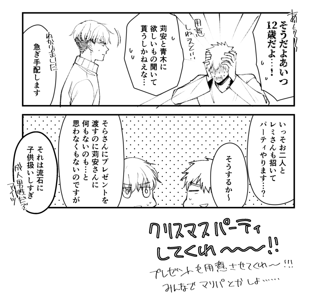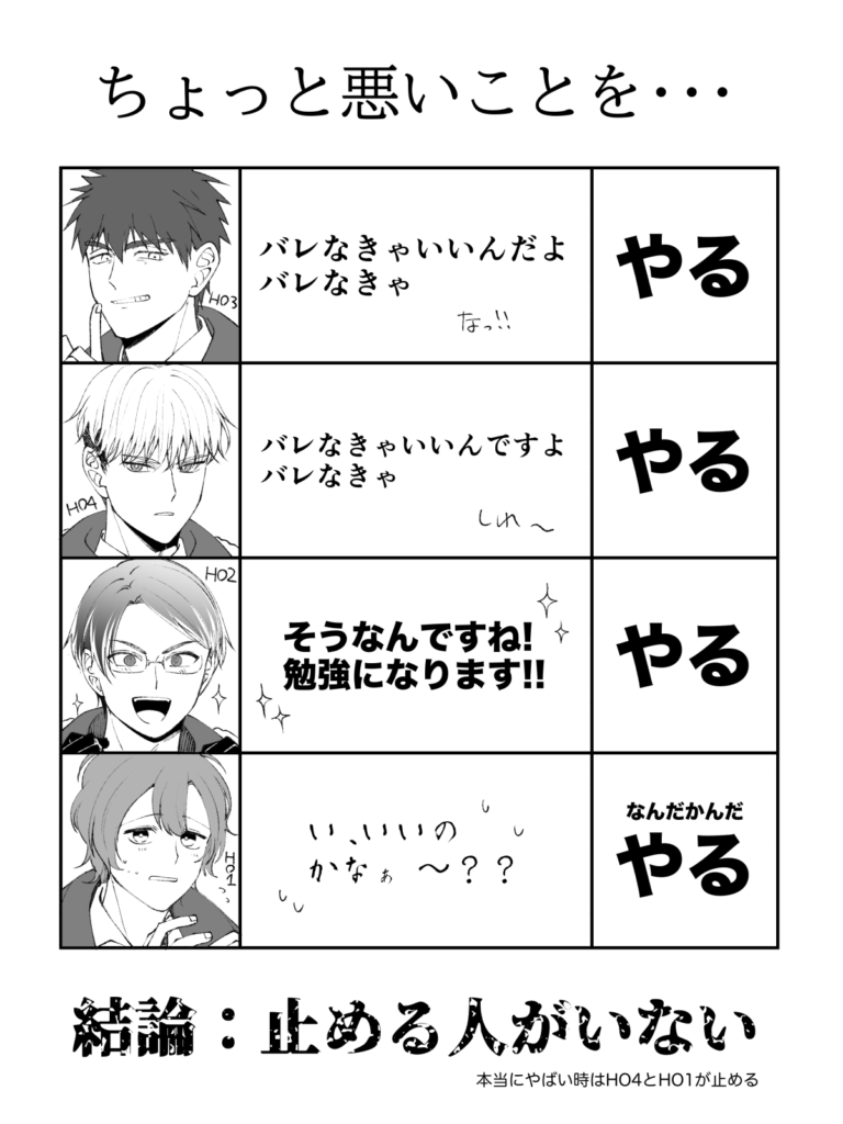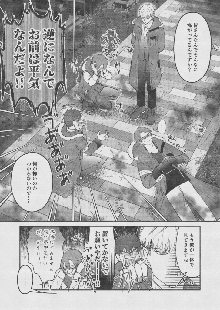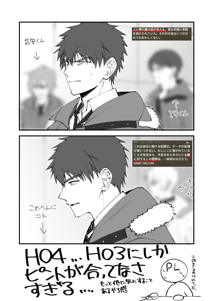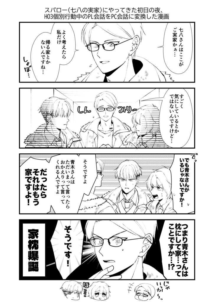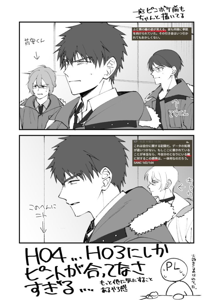 上の場面でまだ1週間くらいの付き合いな苅安くんやそらくんはともかく、下の場面でキョウとニトにピントが合ってないのはちょっとどうかと思う。ちょっとHO3のことが好きすぎるのではないか。
